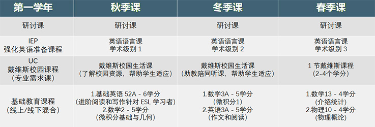 专门为国际学生设计的(2+2)共四年的大学项目,前两年为学生提供强化的英语课程及基础大学课程,后两年该项目学生则与常规的加州大学戴维斯一样,正常完成大三和大四的学业。